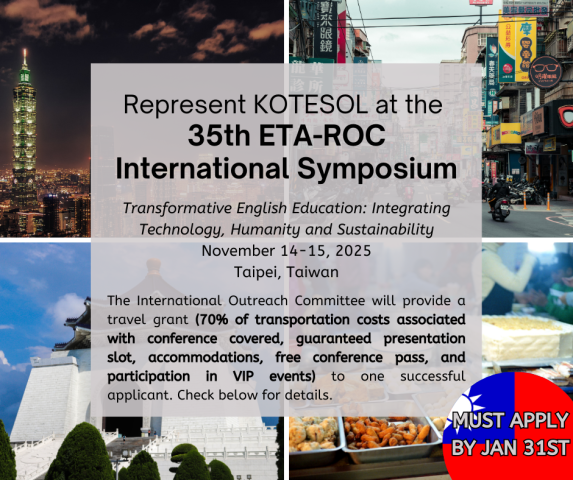 The International Outreach Committee is looking for a KOTESOL members to represent our organization at 2026's ETA-ROC event in Tapei, Taiwan!