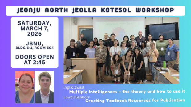 Ingrid Zwaal has been in Jeonju since 1994, KOTESOL member since 1998, World Cup 2002 volunteer, musician, actor, singer, columnist, dancer, D&D player, sword enthusiast, volleyball player and dog mother. She has been a frequent presenter for KOTESOL and current JNJ