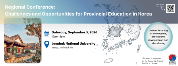 Jeonju - North Jeolla KOTESOL invites proposals for the 2026 Regional Conference, to be held on Saturday, September 5, 2026.