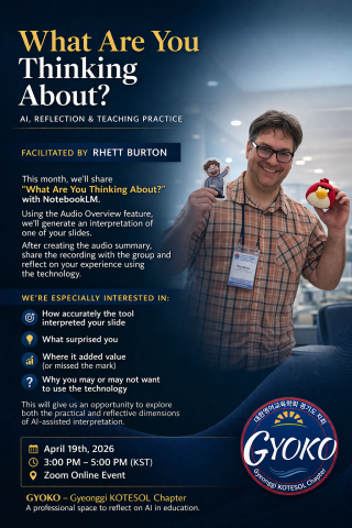 This month, we will have an informal round table discussion on our reflections, favourite moments, and professional takeaways from the KOTESOL International Conference.