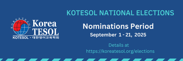 KOTESOL members are encouraged to consider how they may serve the organization in the coming year. For detailed information on elected offices, nomination procedures, voting dates, etc., go to the Nomination and Elections pages at https://koreatesol.org/elections.