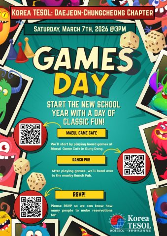 Start the semester by reconnecting with colleagues and meeting fellow educators at the KOTESOL Daejeon-Chungcheong Games Night! Join us for a relaxed afternoon of board games, conversation, and community building at Maeul Board Game Comic Cafe.