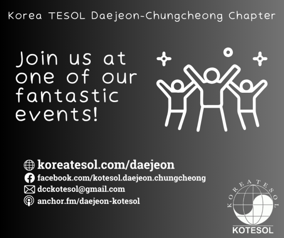 Welcome to the Daejeon-Chungcheong Chapter of KOTESOL! The purpose of our chapter is to provide leadership, professional development, scholarship and networking in the field of English education, to stimulate teaching and learning and the dissemination of information and research in this field, and to facilitate crosscultural understanding between stakeholders in the areas of the Chungbuk and Chungnam provinces of Korea, including the major centers of Daejeon, Cheongju, Sejong and Cheonan-Asan.