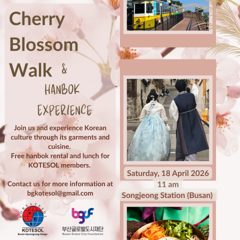 Spaces are limited, so please contact us at bgkotesol@gmail.com to reserve your place. This event is open to all KOTESOL members.