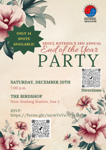 As 2025 draws to a close, Seoul KOTESOL wishes to extend a cordial invitation to our annual end of year dinner. We have held this event for the last few years and it has always been a great opportunity to connect and reflect with those in and around the Seoul KOTESOL community. Consider spending a few hours of the waning year with us.